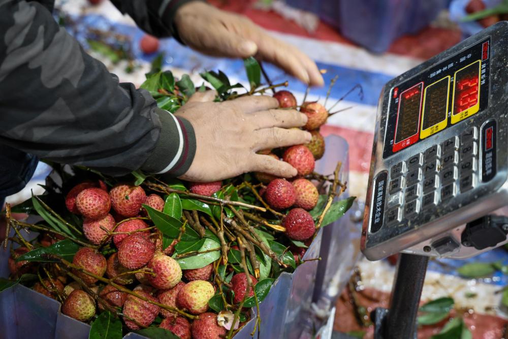 ↑6月4日,在廣東茂名高州市廣東銘景農業(yè)發(fā)展有限公司,工作人員對即將運往海外的荔枝進行稱重。