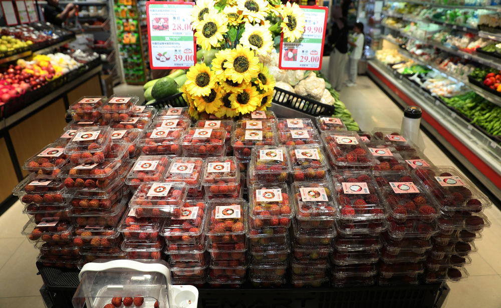 ↑這是6月21日在阿聯(lián)酋迪拜溫超超市拍攝的荔枝貨架。