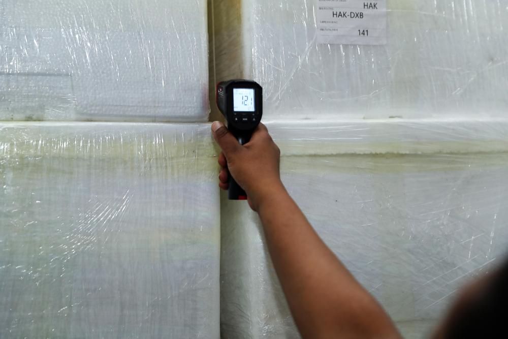 ↑6月20日,在阿聯(lián)酋迪拜溫超超市倉庫,工作人員對剛剛空運到貨的荔枝箱測溫。