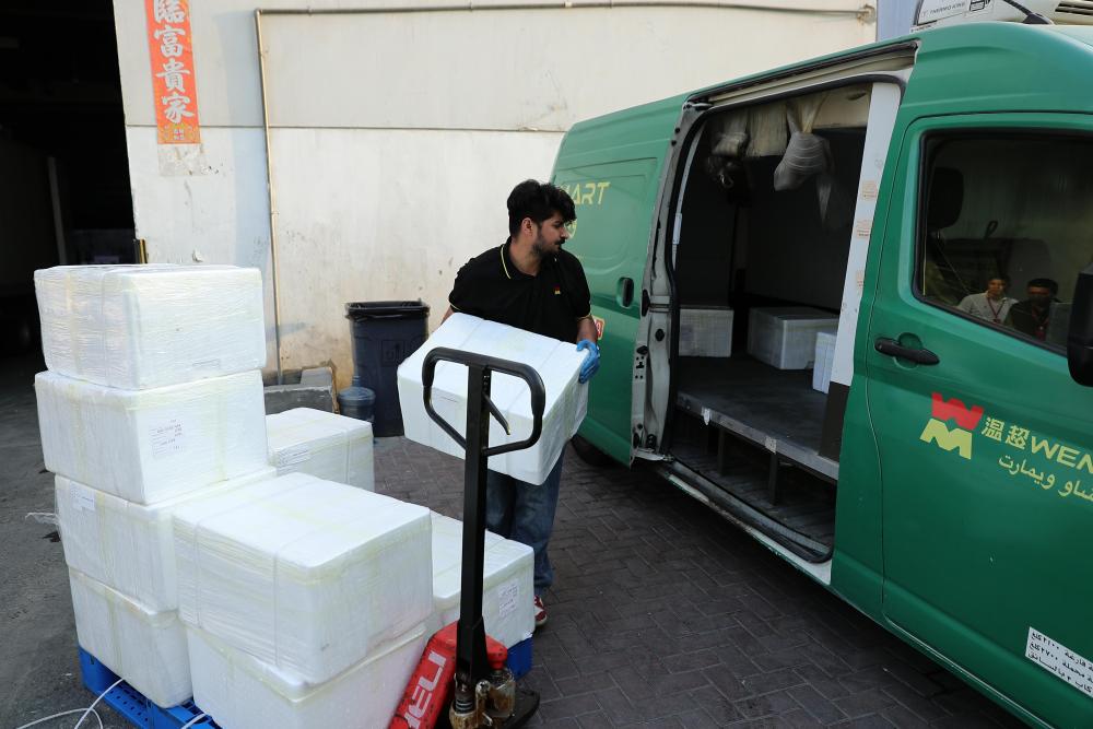 ↑6月20日,在阿聯(lián)酋迪拜溫超超市倉庫,工作人員將剛剛空運到貨的荔枝搬上貨車,準備運至門店銷售。