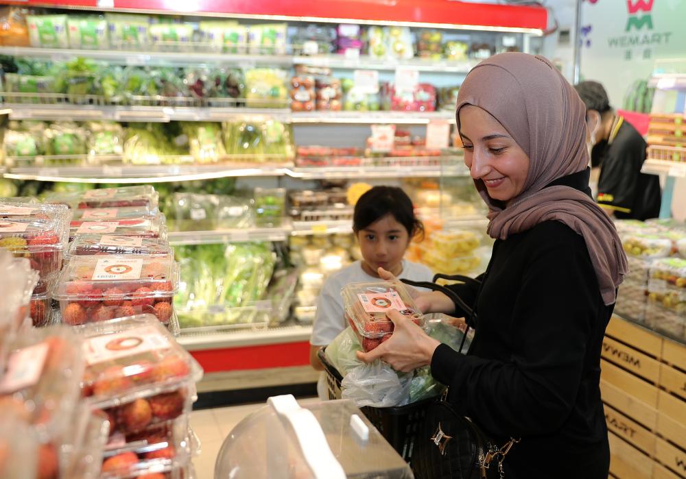 ↑6月20日,在阿聯(lián)酋迪拜溫超超市,消費者選購荔枝。