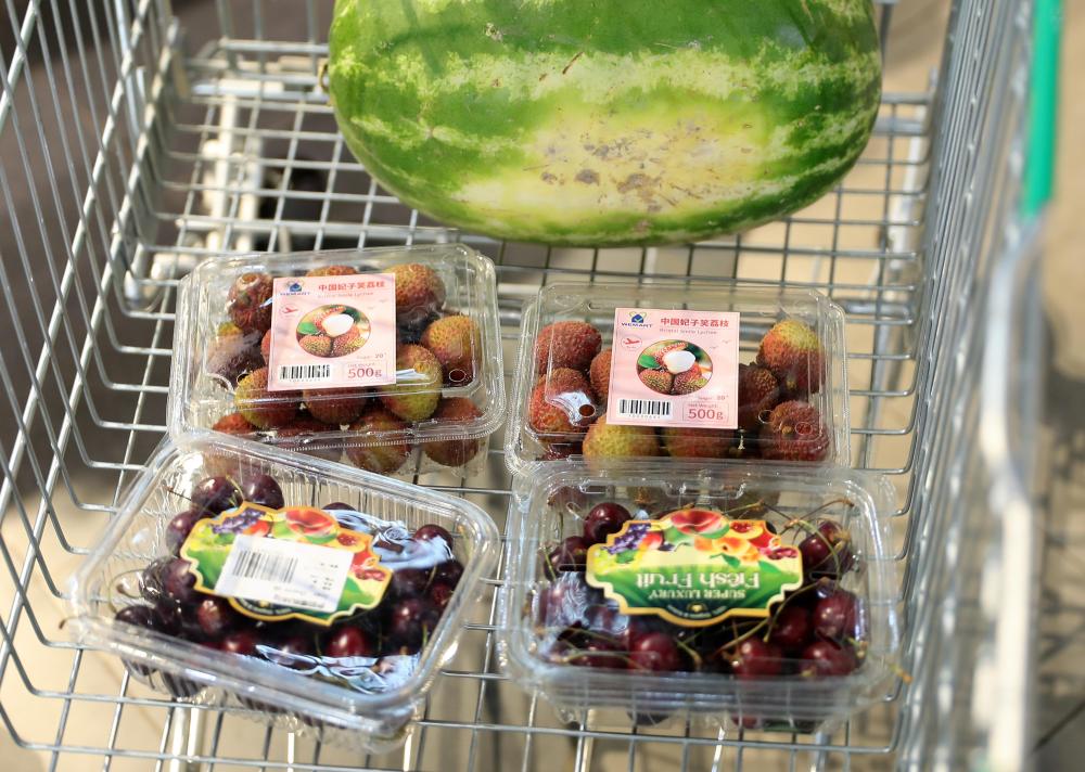 ↑這是6月21日在阿聯(lián)酋迪拜溫超超市拍攝的顧客購物車里的荔枝。