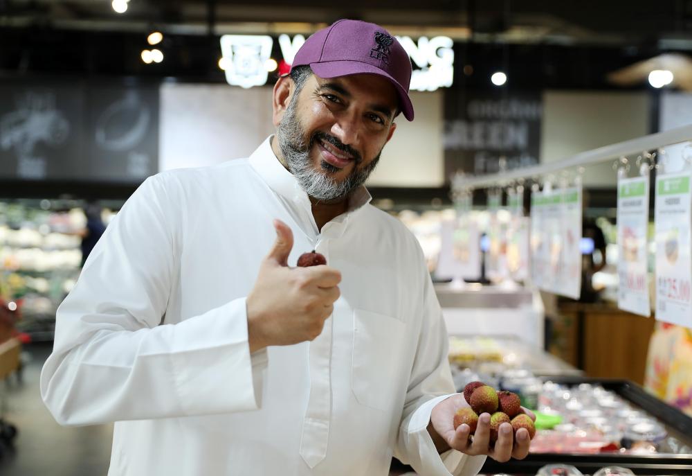 ↑6月21日,在阿聯(lián)酋迪拜溫超超市,消費者品嘗荔枝后豎起大拇指。
