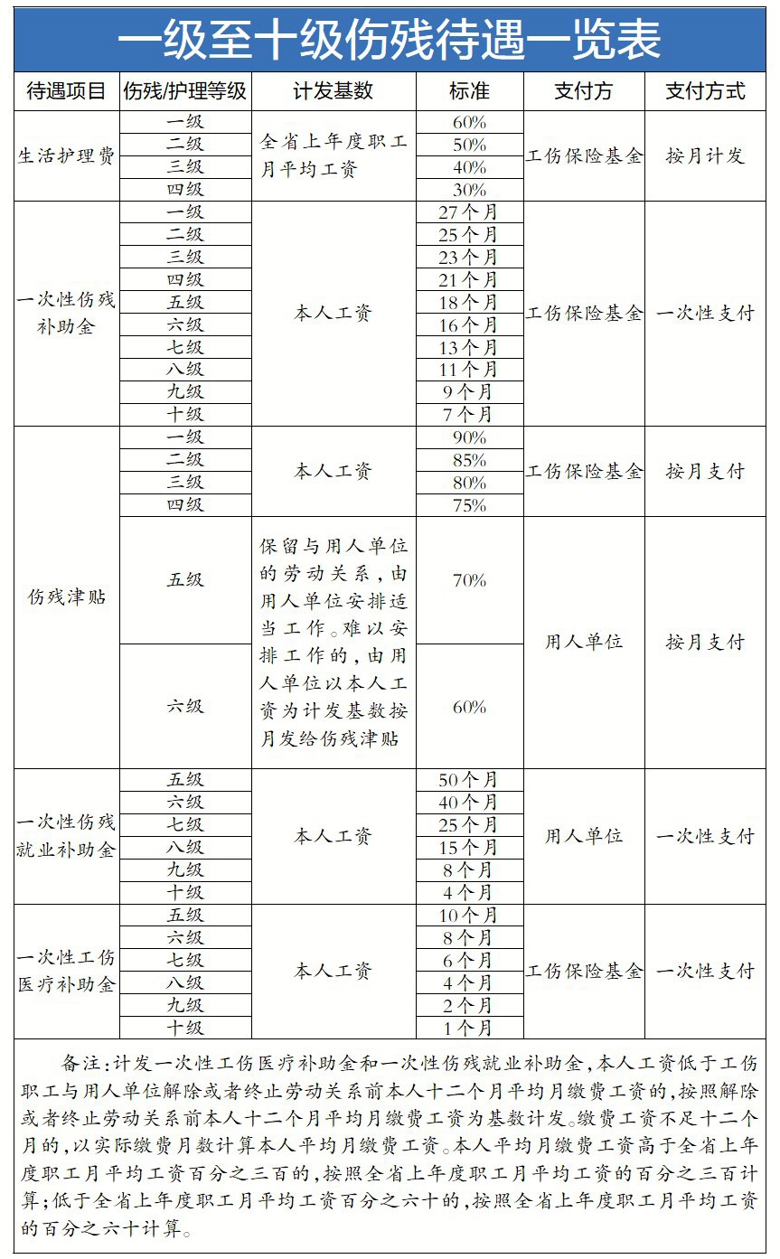 工傷傷殘職工除可享受工傷醫(yī)療費、住院伙食補助費報銷等工傷醫(yī)療待遇外,還可以按規(guī)定享受傷殘津貼、生活護理費、一次性傷殘補助金、一次性工傷醫(yī)療補助金、一次性傷殘就業(yè)補助金等傷殘待遇(具體見《一級至十級傷殘待遇一覽表》)。