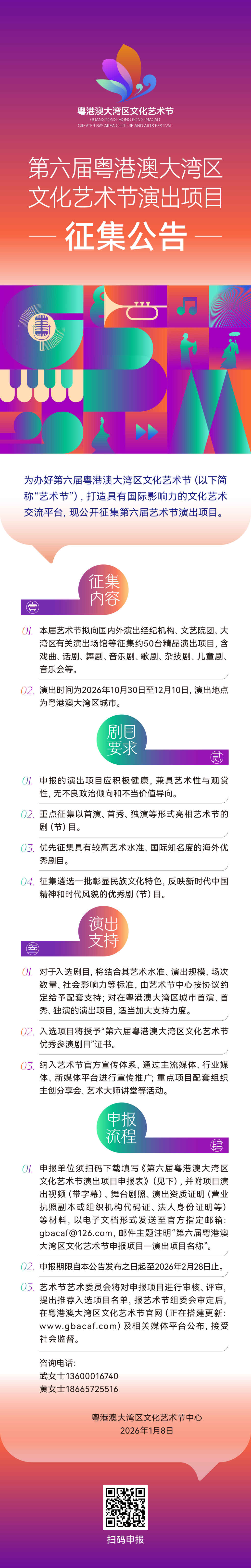 1月8日,第六屆粵港澳大灣區(qū)文化藝術(shù)節(jié)正式啟動(dòng)演出項(xiàng)目全球征集,一場匯聚多元藝術(shù)的灣區(qū)文藝盛宴即將啟幕。