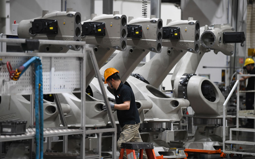 2025年3月25日在廣東佛山市美的庫卡智能制造科技園拍攝的工業(yè)機(jī)器人產(chǎn)線車間。新華社記者 鄧華 攝