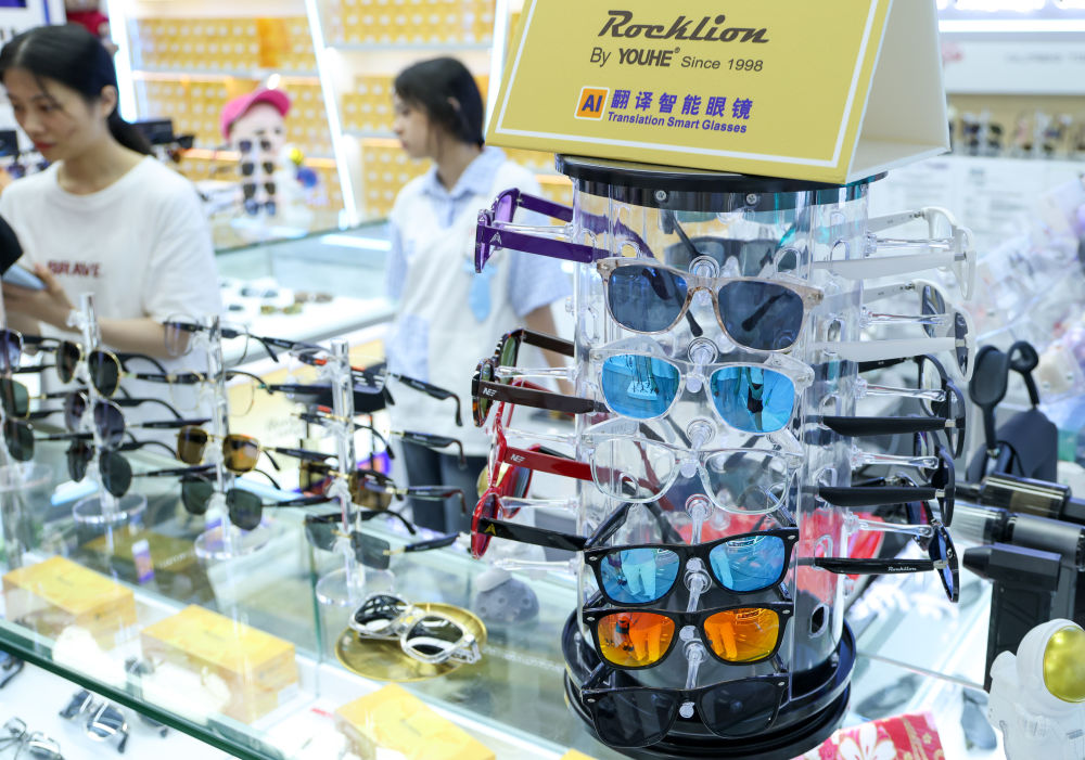 2025年7月22日,深圳華強(qiáng)北一家商戶的柜臺上擺放著不同款式的智能眼鏡。新華社記者 毛思倩 攝