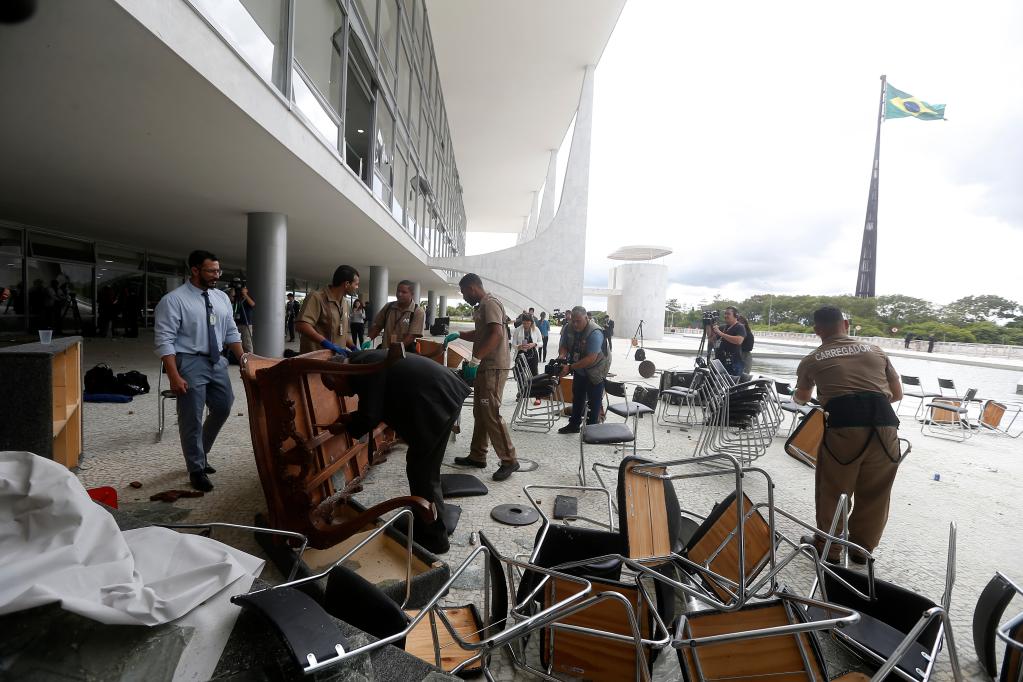 因不滿去年10月的大選結果,數(shù)千名博索納羅的支持者1月8日闖入位于首都巴西利亞的國會大廈、聯(lián)邦最高法院和總統(tǒng)府,對內部設施和設備實施打砸破壞,導致總統(tǒng)府窗戶破損、辦公用品散亂,國會大廈部分區(qū)域淹水,最高法院多個會議廳遭洗劫。部分示威者還與軍警發(fā)生沖突。據(jù)巴西警方透露,目前共有超過1500名暴力示威者被逮捕。