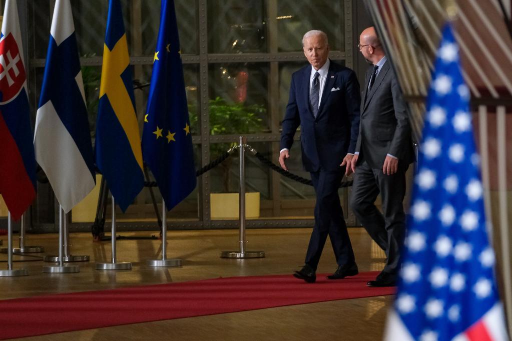 2022年3月24日,美國總統(tǒng)拜登(左)和歐洲理事會主席米歇爾抵達歐盟總部。(新華社記者張鋮攝)