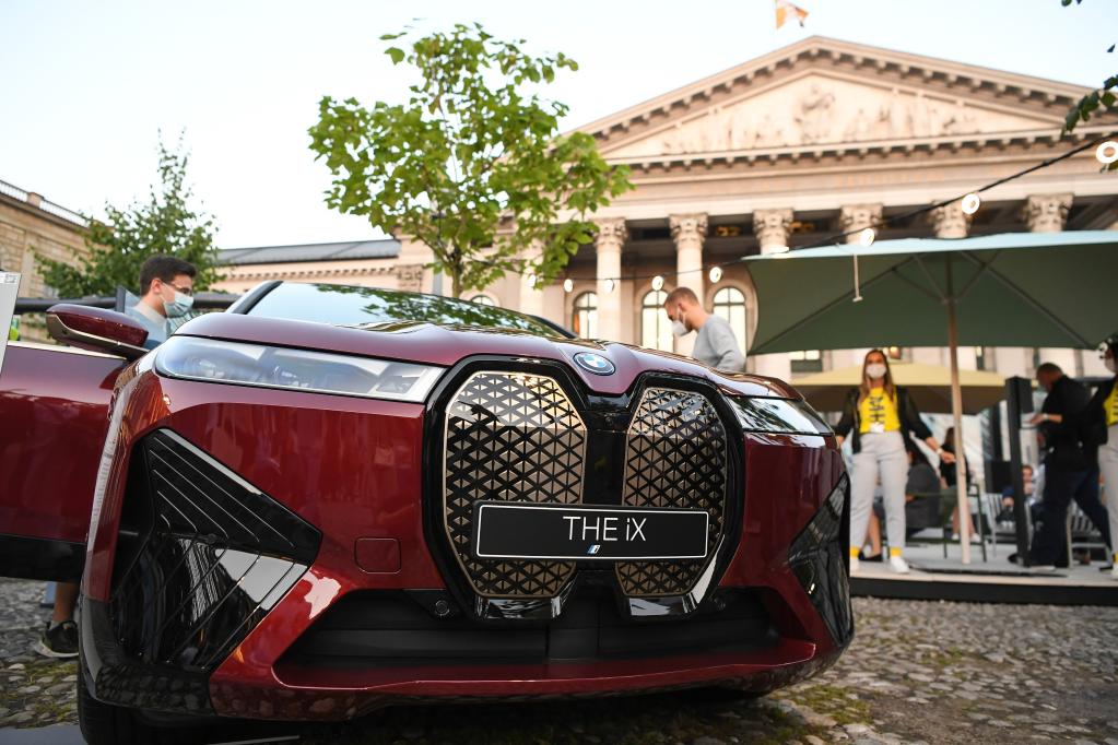 這是2021年9月8日在德國慕尼黑國際車展寶馬汽車戶外展區(qū)拍攝的一臺寶馬iX電動車。(新華社記者逯陽攝)