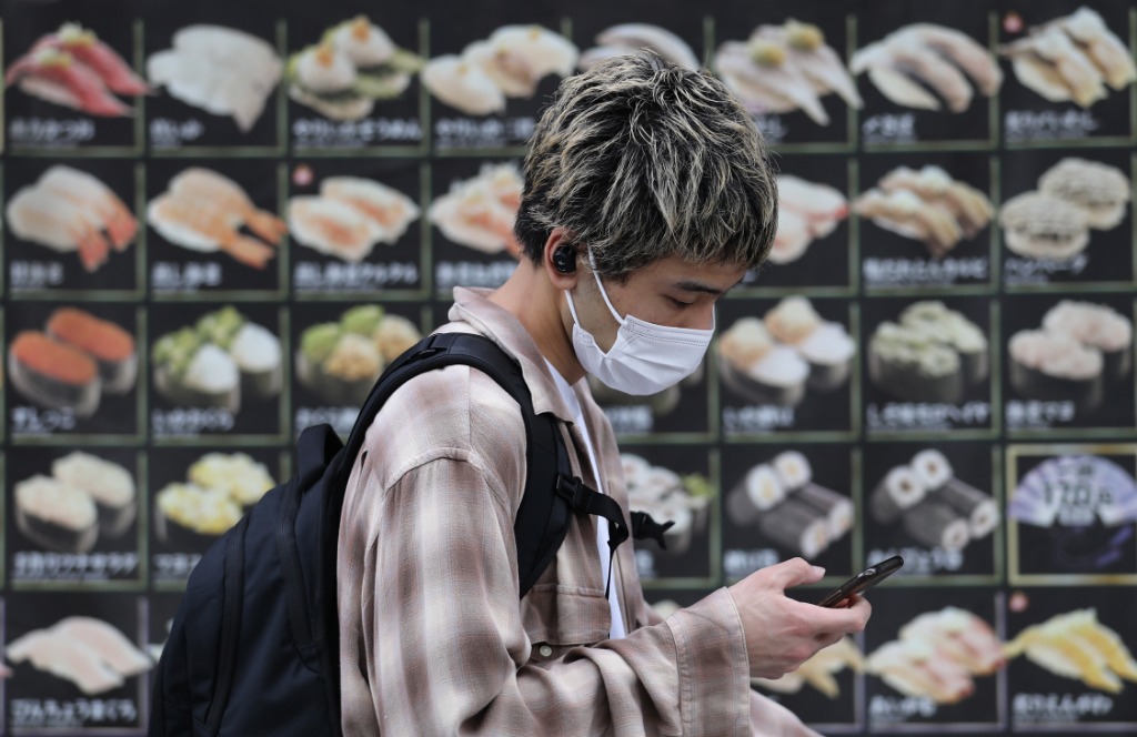 2020年5月4日,在日本東京,戴口罩的行人從壽司店前經(jīng)過。新華社記者杜瀟逸攝