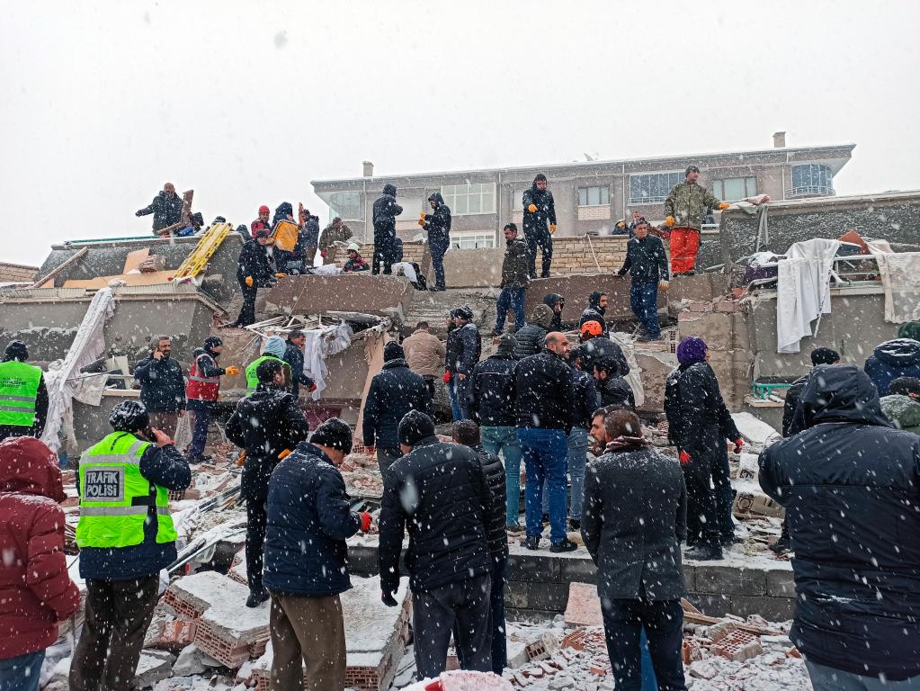 2月6日,人們在土耳其馬拉蒂亞一處倒塌的建筑上搜救。新華社發(fā)(穆斯塔法·卡亞攝)
