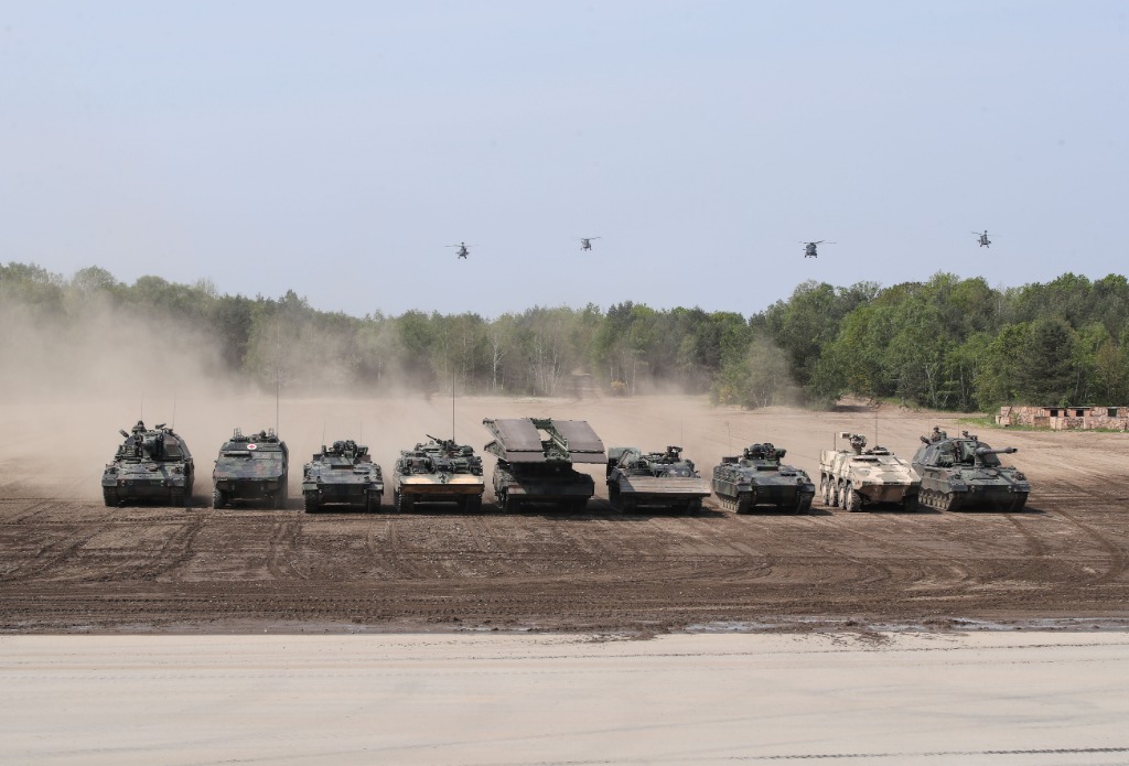 2019年5月20日,在德國(guó)蒙斯特,北約快速反應(yīng)部隊(duì)裝甲車(chē)及直升機(jī)參與演示。(新華社記者單宇琦攝)