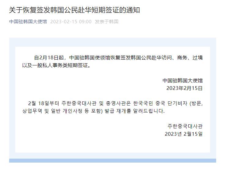 自2月18日起,中國駐韓國使領館恢復簽發(fā)韓國公民赴華訪問、商務、過境以及一般私人事務類短期簽證。