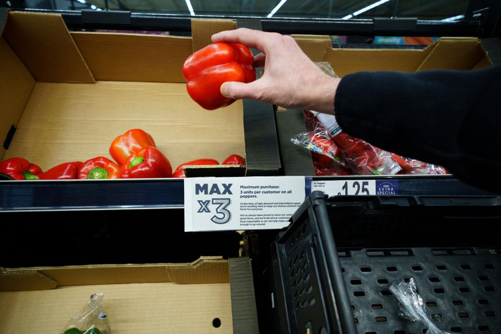 這是2月23日在英國(guó)曼徹斯特一家超市拍攝的蔬菜貨架上的限購(gòu)?fù)ㄖ。按照通知,每名顧客一次只能最多?gòu)買3個(gè)彩椒。新華社發(fā)(喬恩·休珀攝)