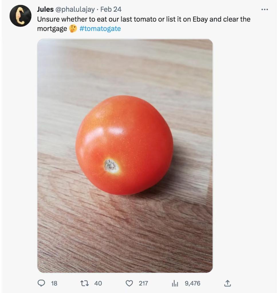 有英國(guó)網(wǎng)友在社交媒體上公布的賬單顯示,2月末他花費(fèi)了25英鎊(折合人民幣206.53元)購(gòu)買了一袋共6個(gè)西紅柿。還有英國(guó)網(wǎng)友調(diào)侃說,看著家里最后一個(gè)西紅柿,難以決定是把它吃掉,還是把它賣掉還房貸。