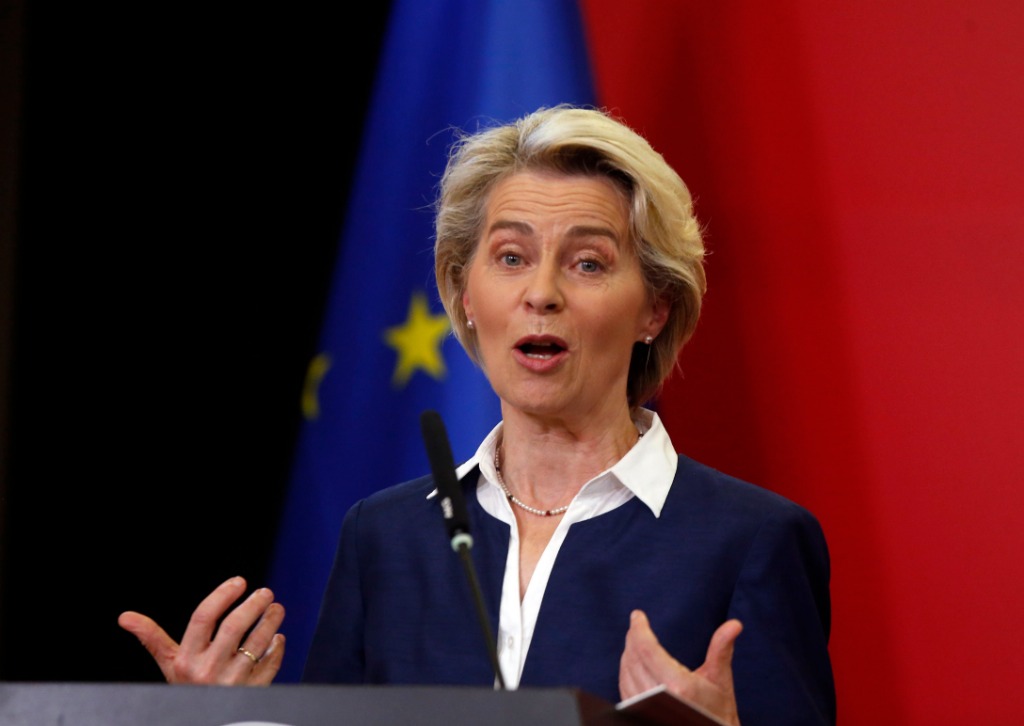 2022年10月26日,在北馬其頓斯科普里,歐盟委員會主席馮德萊恩在與北馬其頓總理科瓦切夫斯基(不在畫面中)舉行的聯(lián)合新聞發(fā)布會上講話。新華社發(fā)(托米斯拉夫·格奧爾基耶夫攝)