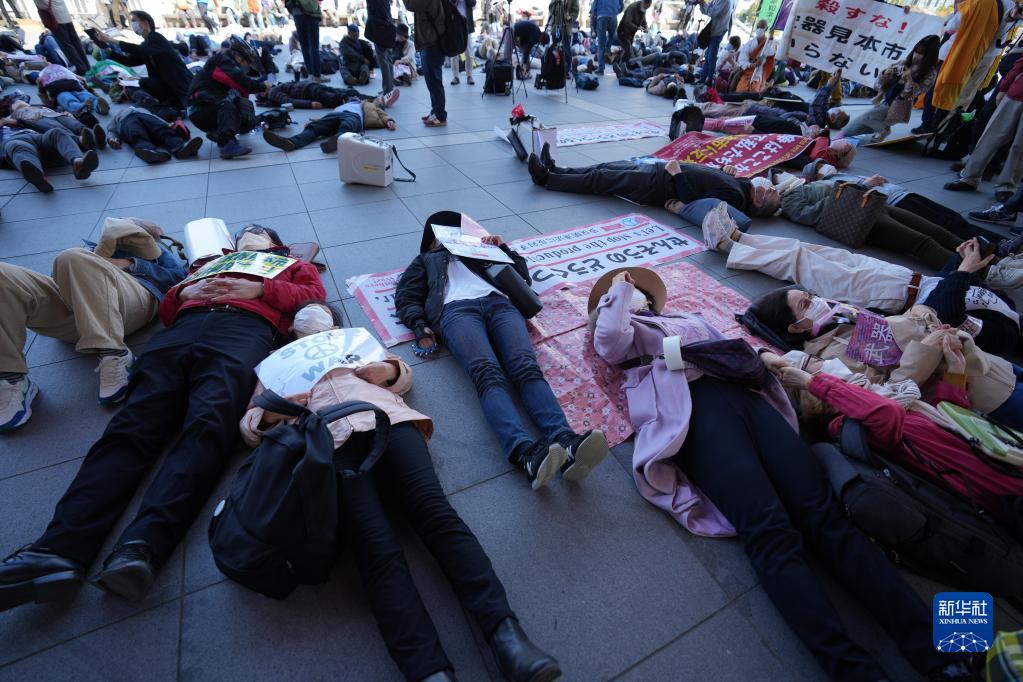 3月15日,民眾在日本千葉縣幕張會(huì)展中心門前抗議。新華社記者 張笑宇 攝