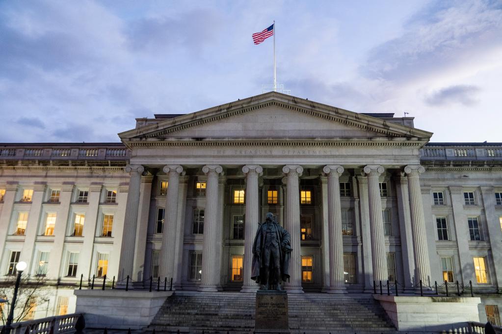 這是1月20日在美國首都華盛頓拍攝的財政部大樓。(新華社記者劉杰攝)