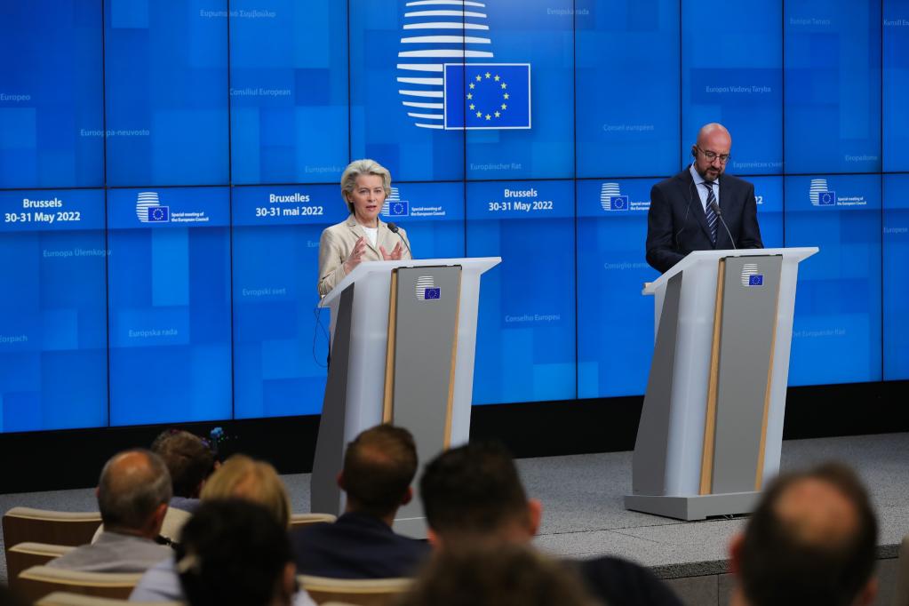 2022年5月31日,在比利時(shí)布魯塞爾,歐盟委員會(huì)主席馮德萊恩(左)和歐洲理事會(huì)主席米歇爾在歐盟特別峰會(huì)后舉行新聞發(fā)布會(huì)。本次峰會(huì)決定對(duì)俄羅斯實(shí)施石油禁運(yùn),并逐漸擺脫對(duì)俄羅斯能源依賴。新華社記者鄭煥松攝