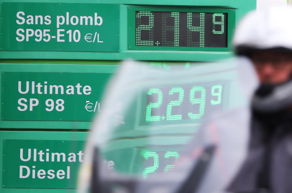 2022年3月16日,一名男子騎摩托車經(jīng)過(guò)法國(guó)巴黎一處加油站。新華社記者高靜攝