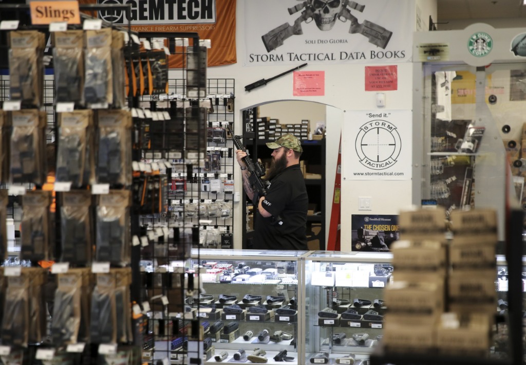 2017年10月4日,在美國拉斯維加斯的“新前線”槍械商店,一名店員為顧客展示槍支。“新前線”是當(dāng)?shù)匾?guī)模較大的一家槍械商店,售賣槍支彈藥、槍周邊用品、槍文化衍生品等。新華社記者王迎攝