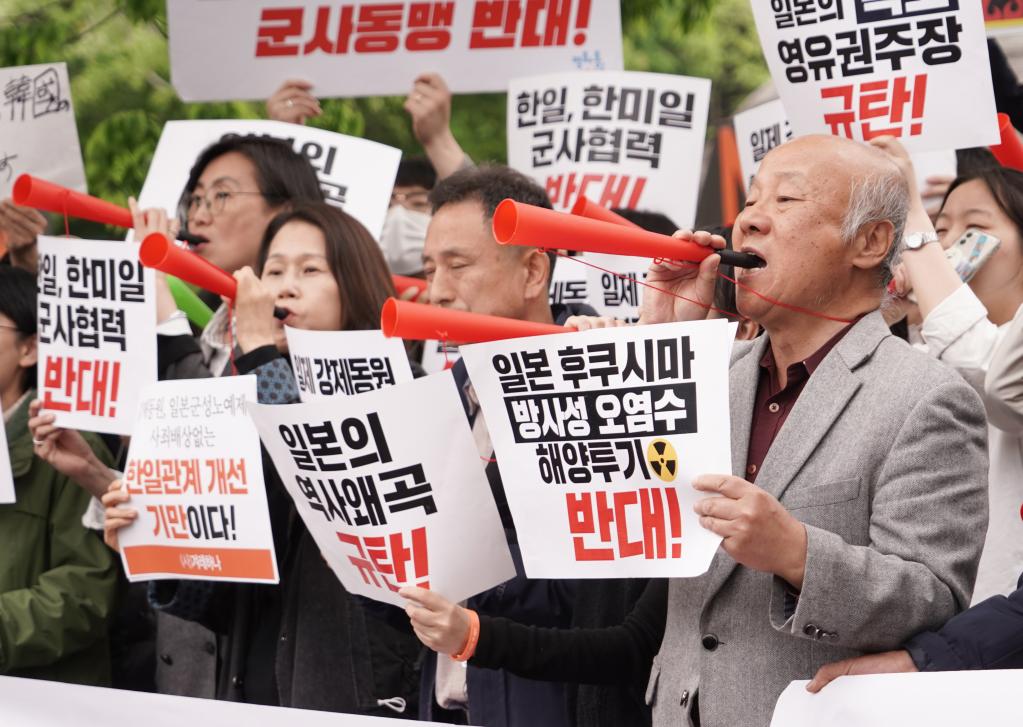 在韓國總統(tǒng)府前的集會(huì)現(xiàn)場,民眾手持“停止構(gòu)建韓美日同盟”“停止對(duì)日屈辱外交”“立即撤回核污染水排海計(jì)劃”等標(biāo)語。他們要求日本政府對(duì)二戰(zhàn)期間的殖民統(tǒng)治進(jìn)行道歉并給予賠償,強(qiáng)烈呼吁停止擴(kuò)大韓美日三方軍事合作,共同維護(hù)地區(qū)和平穩(wěn)定。