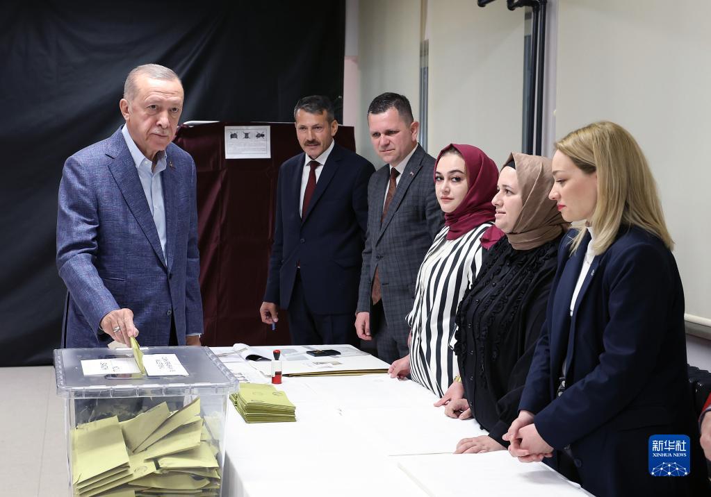 5月14日,在土耳其伊斯坦布爾,現(xiàn)任總統(tǒng)埃爾多安(左一)在一處投票站投票。新華社發(fā)(穆斯塔法·卡亞 攝)