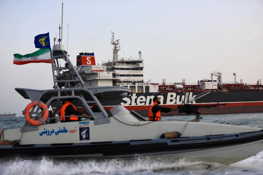 2019年7月21日,在伊朗霍爾木茲海峽附近,伊朗伊斯蘭革命衛(wèi)隊(duì)的船只在“史丹納帝國”號油輪周圍巡邏。伊朗官員21日說,伊方所扣押一艘英國籍油輪“史丹納帝國”號上的船員安全,伊方將依據(jù)規(guī)定調(diào)查這艘油輪。新華社/伊朗學(xué)生通訊社