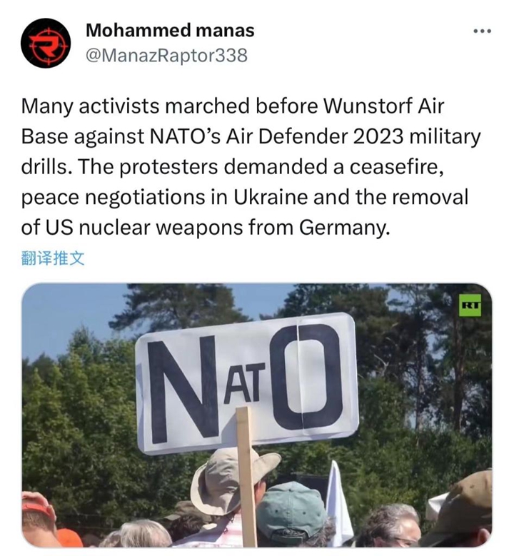 北約正在德國等地舉行成立以來規(guī)模最大的空中軍事演習,為期長達11天,25個國家約1萬名軍人和250架各型軍機參加。接連三天,德國多地舉行抗議活動,批評以美國為首的北約通過輸出軍援、大規(guī)模軍演來持續(xù)“拱火”俄烏沖突。