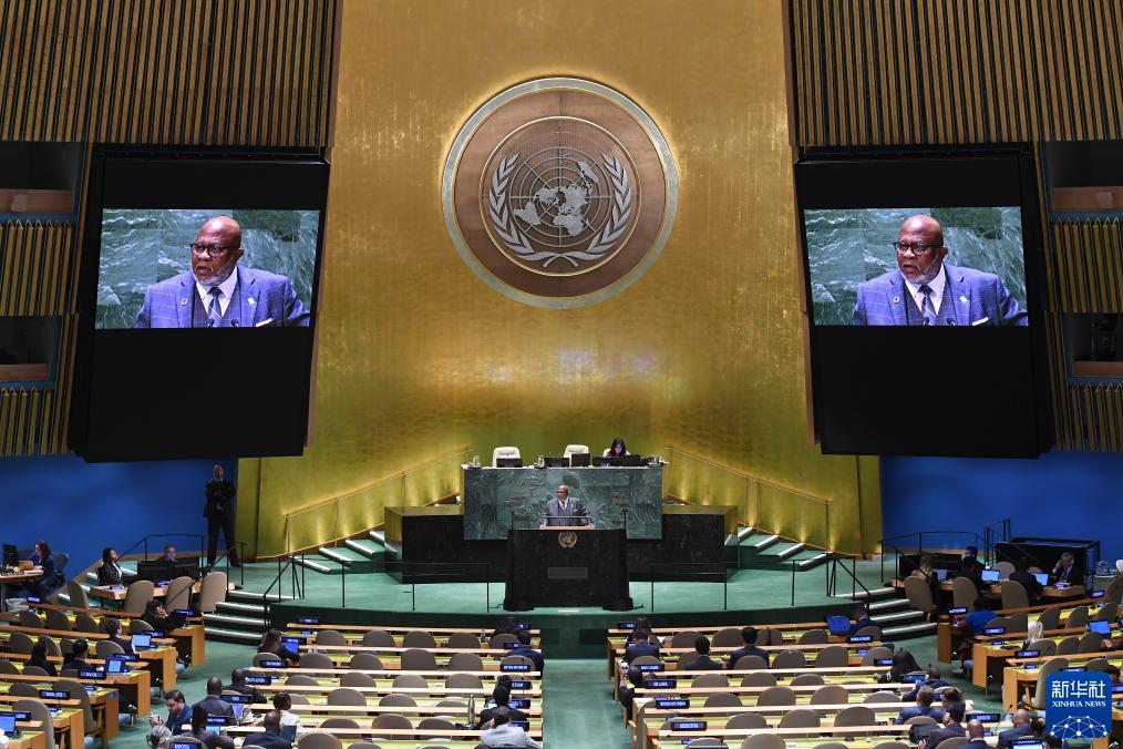 9月26日,在位于紐約的聯(lián)合國總部,第78屆聯(lián)大主席弗朗西斯(中)發(fā)表聯(lián)合國大會一般性辯論閉幕講話。 新華社記者李睿攝