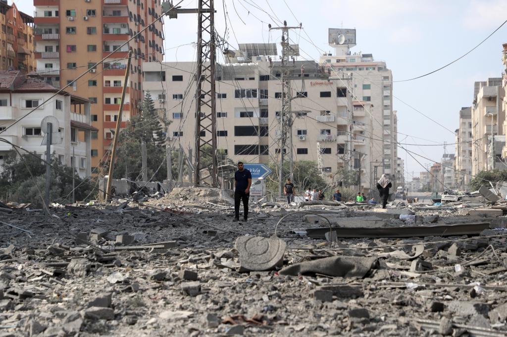 10月10日,在加沙城,人們走過被以色列空襲炸毀的建筑廢墟。新華社發(fā)(里澤克·阿卜杜勒賈瓦德攝)