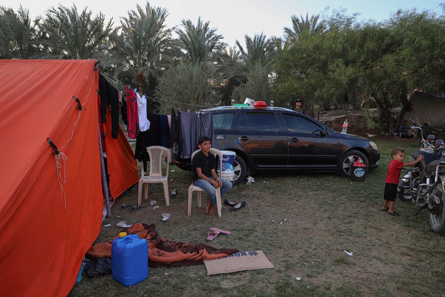 10月17日,在加沙地帶南部城市汗尤尼斯,人們在醫(yī)院避難所內(nèi)休息。新華社發(fā)(里澤克·阿卜杜勒賈瓦德攝)