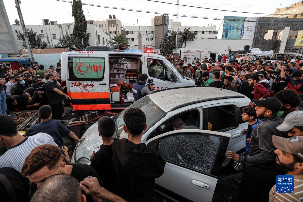 11月3日,在加沙城希法醫(yī)院門口,人們查看被襲擊的車輛。新華社發(fā)