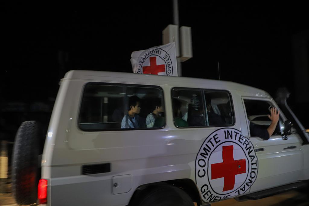 11月25日,紅十字國際委員會工作人員將被釋放人員送往加沙地帶南部拉法口岸。新華社發(fā)(里澤克·阿卜杜勒賈瓦德攝)