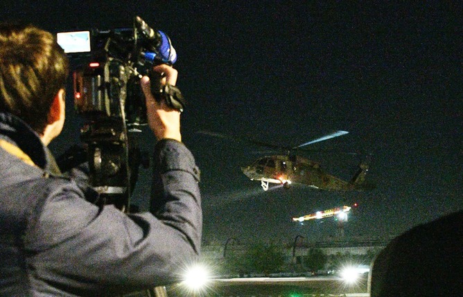 11月30日,哈馬斯釋放的第七批被扣押人員中的2人搭乘直升機抵達以色列拉馬特甘的一所醫(yī)院。新華社/基尼圖片社