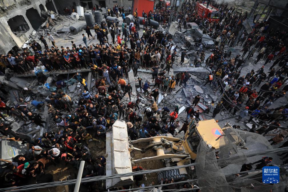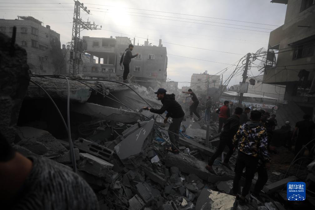 12月20日,在加沙地帶南部城市拉法,人們在以軍空襲后開展救援。新華社發(fā)(亞西爾·庫迪攝)