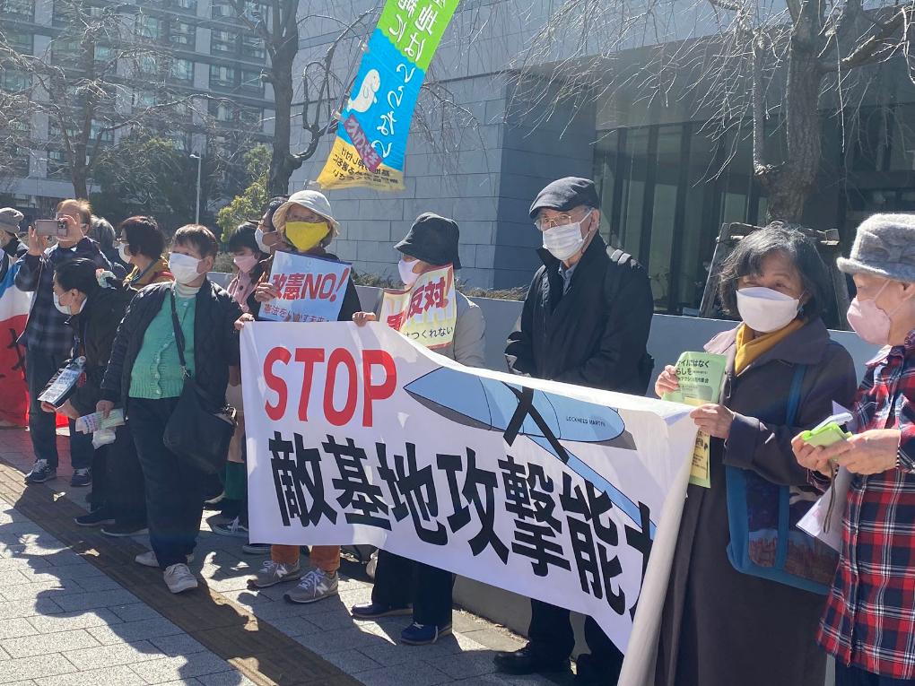 2月28日,在日本東京,日本民眾舉著標(biāo)語(yǔ)牌抗議日本眾議院通過(guò)高額的防衛(wèi)費(fèi)預(yù)算案。新華社記者郭丹攝