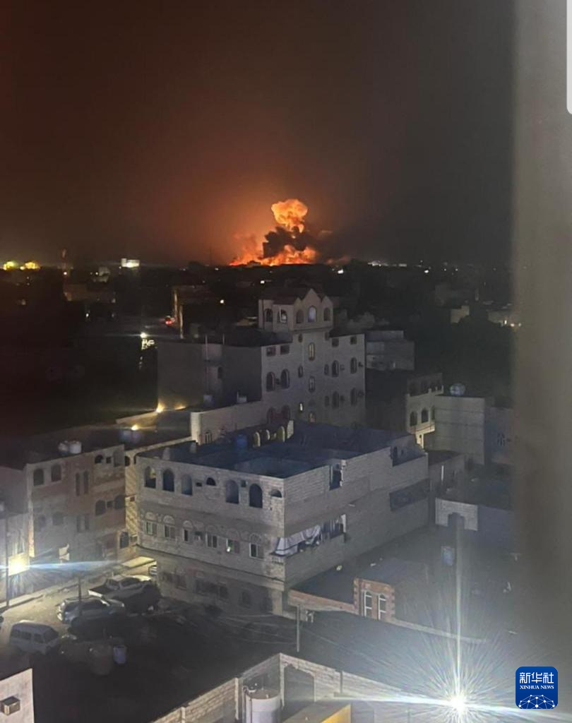 ??這是1月12日在也門首都薩那拍攝的空襲后的爆炸畫面(手機照片)。據(jù)也門薩巴通訊社12日報道,美國和英國的戰(zhàn)機在當?shù)貢r間12日凌晨空襲了也門首都薩那、西部紅海城市荷臺達和北部薩達省內(nèi)的多處目標。新華社發(fā)