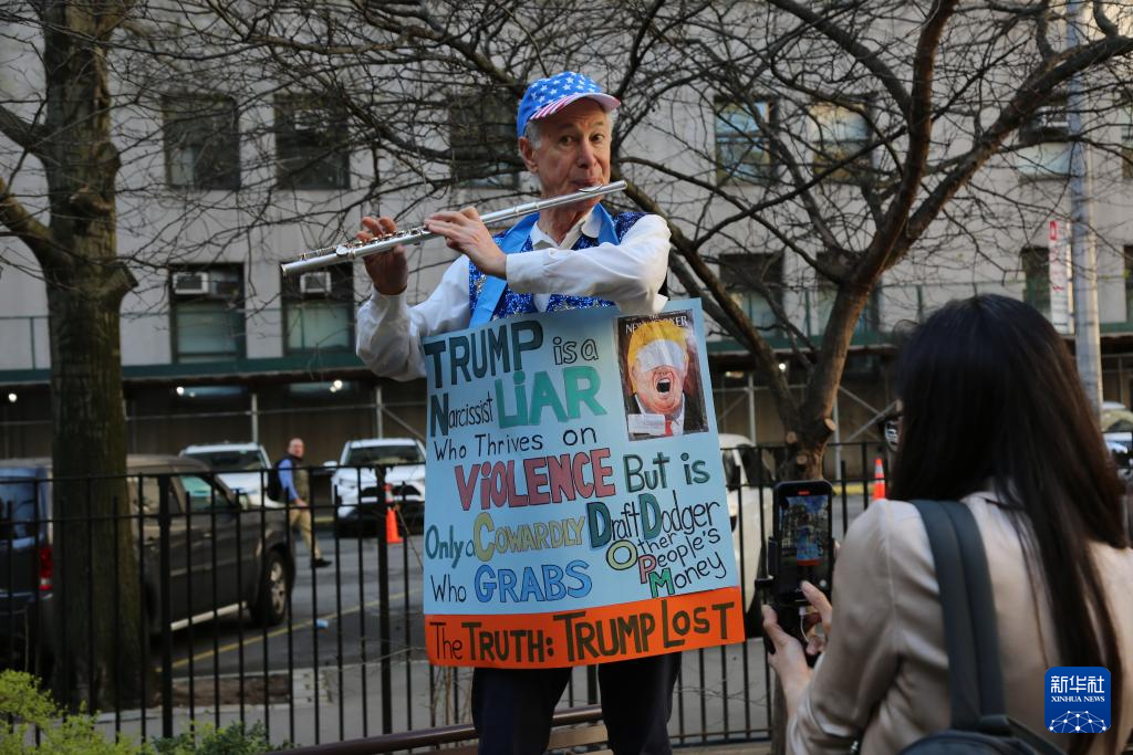 4月15日,在美國(guó)紐約,美國(guó)前總統(tǒng)特朗普的反對(duì)者在法庭前的公園掛著標(biāo)語(yǔ)牌演奏樂(lè)器。新華社記者 劉亞南 攝