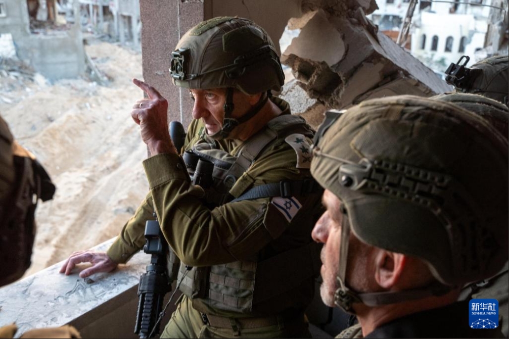 10月17日,以色列國防軍總參謀長(zhǎng)哈萊維(中)在加沙地帶辛瓦爾死亡地點(diǎn)附近視察。新華社發(fā)(以色列國防軍供圖)
