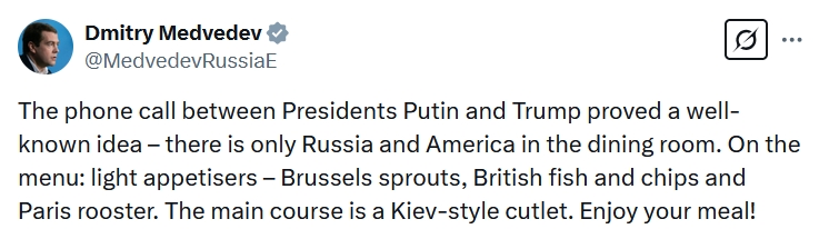 俄羅斯總統(tǒng)普京同特朗普18日通電話(huà)。俄聯(lián)邦安全會(huì)議副主席梅德韋杰夫就此表態(tài)稱(chēng),這表明餐廳里只有俄美,歐洲和烏克蘭都在菜單上,歐洲是開(kāi)胃小菜,而主菜是烏克蘭。