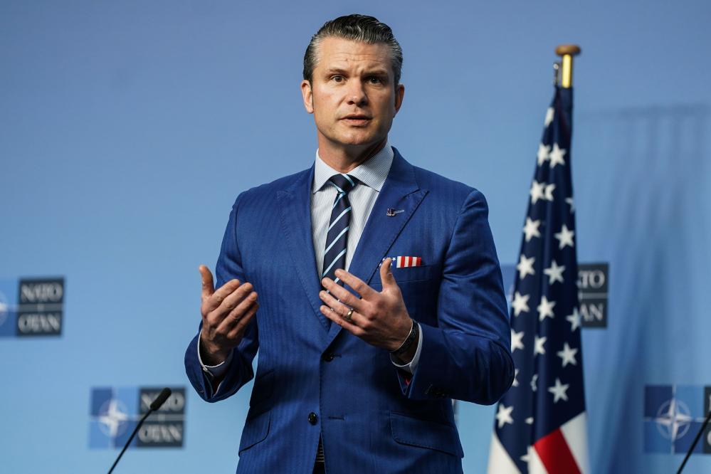 2月13日,在比利時(shí)布魯塞爾,美國(guó)國(guó)防部長(zhǎng)赫格塞思在發(fā)布會(huì)上講話(huà)。新華社記者彭子洋攝
