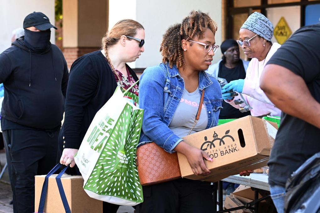10月21日,在美國(guó)馬里蘭州海厄茨維爾市,聯(lián)邦雇員領(lǐng)取免費(fèi)食品。新華社記者李睿攝