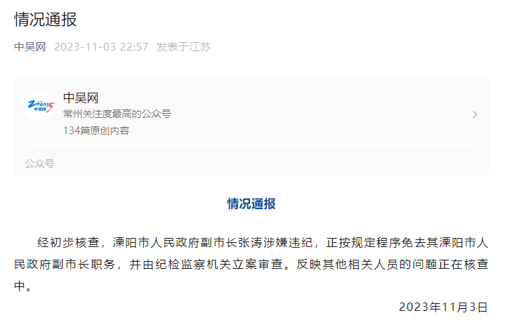 11月3日晚,江蘇常州廣播電視臺微信公眾號“中吳網(wǎng)”發(fā)布了情況通報: