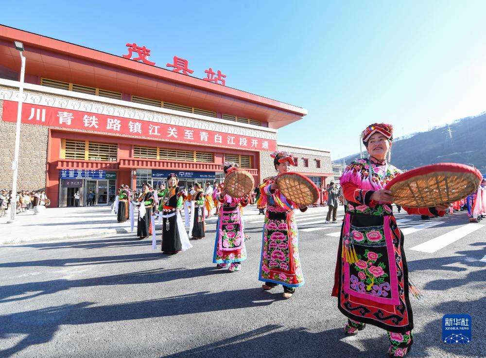11月28日,在川青鐵路茂縣站,當(dāng)?shù)馗髯迦罕娫谡厩皬V場(chǎng)慶祝鐵路開(kāi)通運(yùn)營(yíng)。新華社記者 王曦 攝