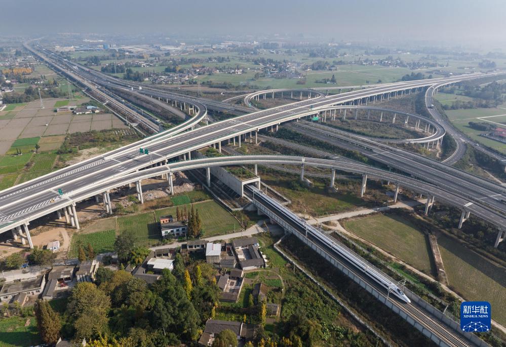 11月28日,首發(fā)列車(chē)C6008次列車(chē)行駛在川青鐵路上,該段與成萬(wàn)高速并行、與成都都市圈環(huán)線高速交會(huì)(無(wú)人機(jī)照片)。新華社記者 江宏景 攝