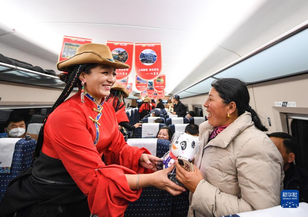 11月28日,在C6008次首發(fā)列車(chē)上,來(lái)自阿壩州民族歌舞團(tuán)的演員給乘客贈(zèng)送紀(jì)念品。新華社記者 王曦 攝