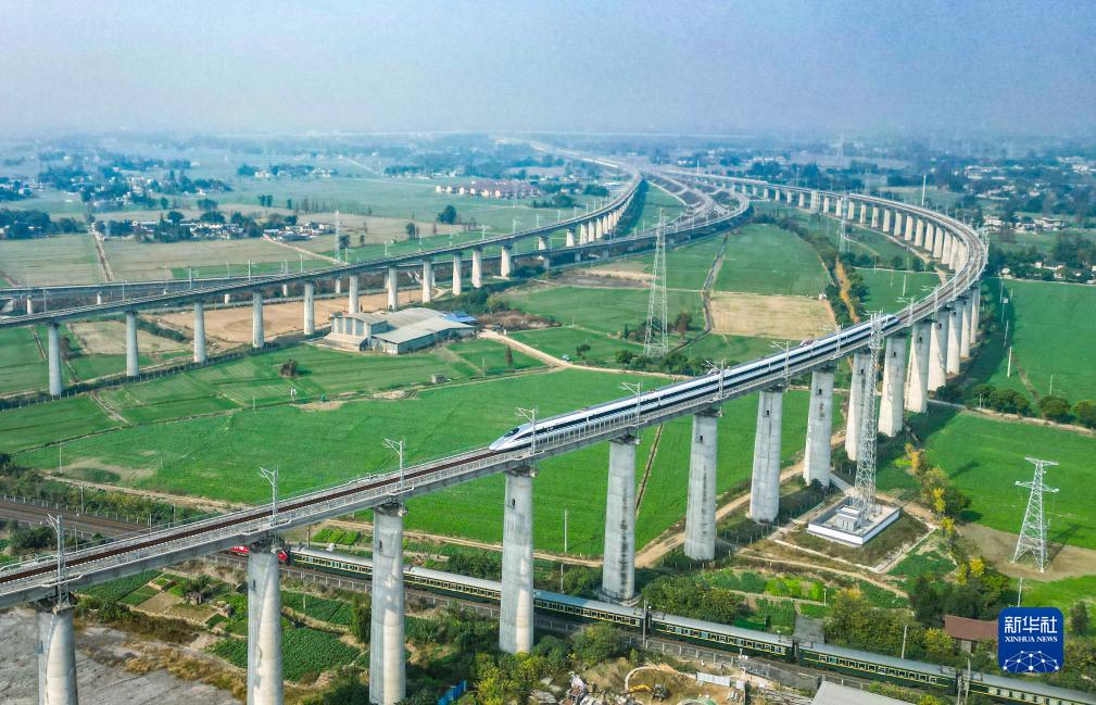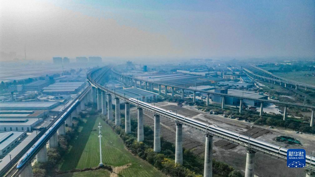11月28日,在成都市青白江區(qū)境內(nèi)拍攝的行駛在川青鐵路上的列車(chē)(上)和行駛在西成高鐵線上的列車(chē)(下)(無(wú)人機(jī)照片)。新華社記者 王曦 攝