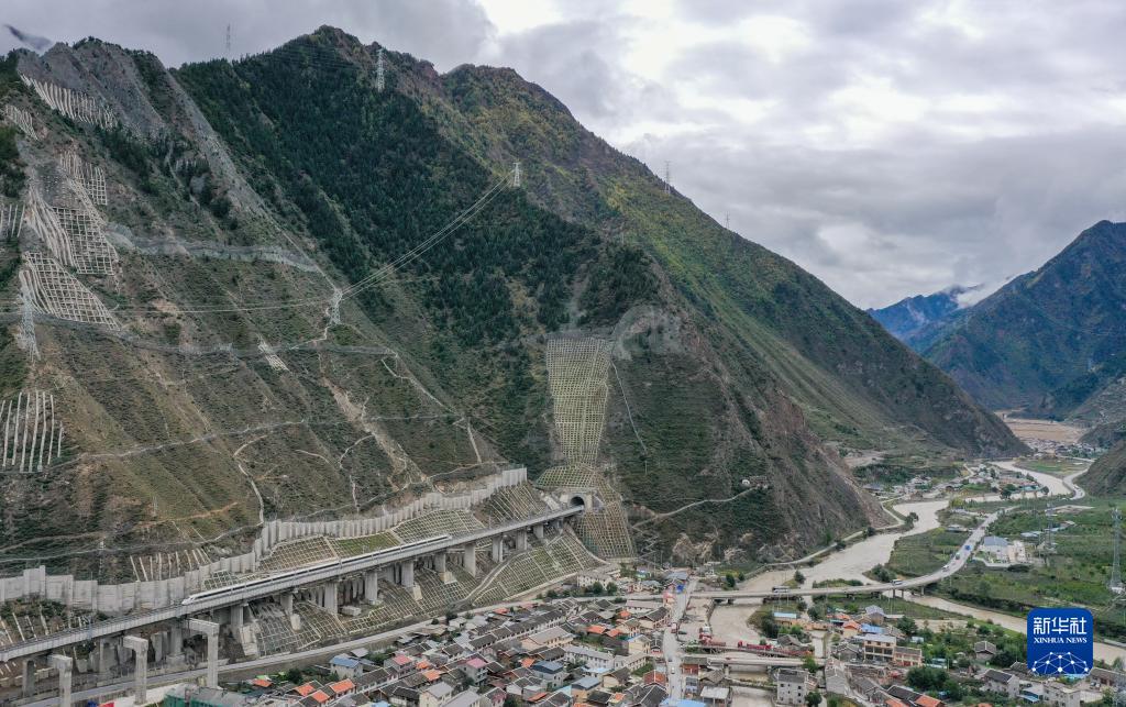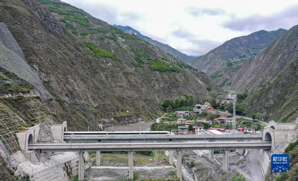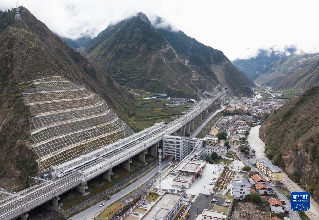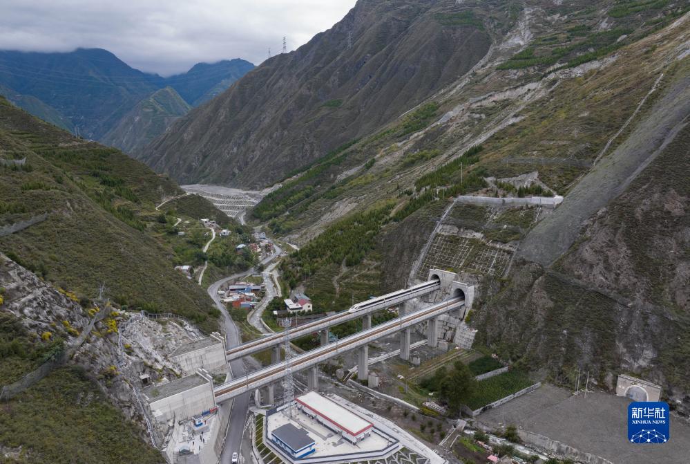 調(diào)試列車(chē)駛?cè)氪ㄇ噼F路茂縣站(10月13日攝,無(wú)人機(jī)照片)。新華社記者 王曦 攝
